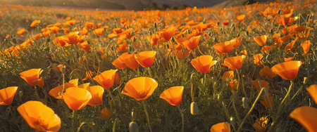 A stunning landscape showcasing a hillside adorned with vibrant orange flowers under a clear sky. The warm sunlight creates a serene atmosphere, perfect for nature lovers.