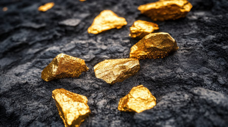 This captivating image features glimmering gold rocks scattered on a dark textured surface, highlighting the beauty and allure of precious metal. The contrast creates an eye-catching display of natural elegance and luxury.