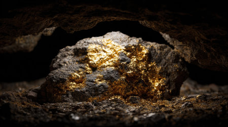 gold nugget on stone, gold inside cave, concept of rarity and luxury
