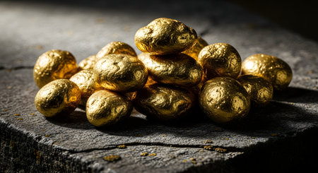 Shiny gold nuggets piled on dark surface reflecting light