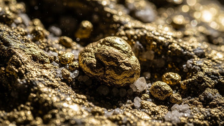provides an extreme close-up view of raw gold nuggets nestled within a matrix of rough earth, mineral deposits, and small white crystals. The gold, with its characteristic metallic sheen and irregular, organic shapes, stands out against the textured, earthy tones of the surrounding The lighting accentuates the gleam and richness of the gold, highlighting its natural beauty and inherent value. The composition suggests a recent discovery or a glimpse into the earth's hidden treasures, evoking...