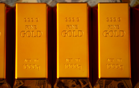 Gleaming gold bars are stacked in neat rows, reflecting the light and symbolizing wealth and opulence.