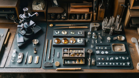 A beautifully organized workspace featuring a variety of gemstones, tools, and a microscope, showcasing the art and science of gemology.