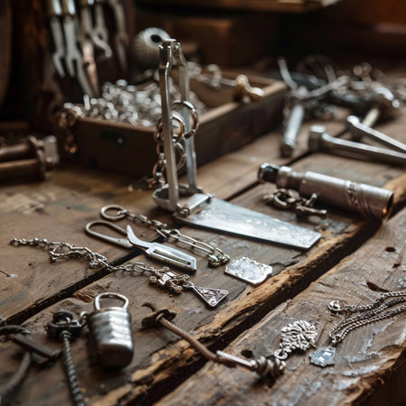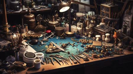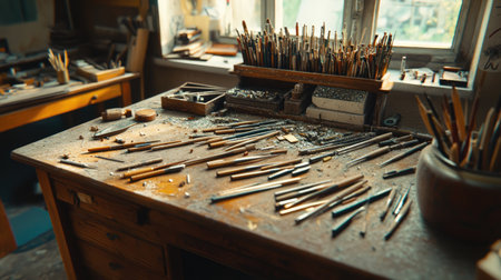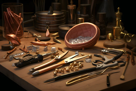 Generative AI Close up of desk with tools and hammers in jewellery workshop