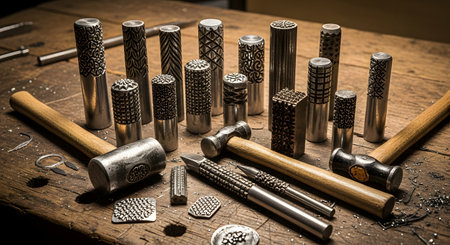 A collection of metalworking tools, including various textured metal stamps and hammers, are laid out on a rustic wooden workbench. These tools are used by jewelers, silversmiths, or blacksmiths for creating patterns and designs on metal.