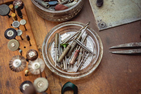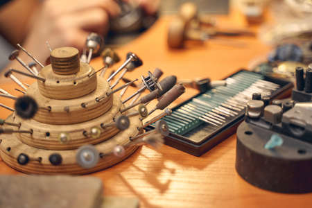 Different goldsmiths tools on the goldsmith workplace.