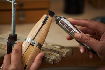 Close up of artisanal craftsman working with wooden tools in studio, copy space
