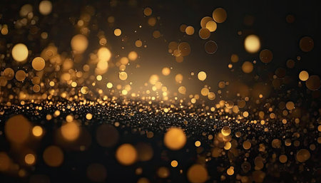 A close-up view of sparkling gold glitter creates a abstract background with soft, glowing bokeh lights in various sizes.