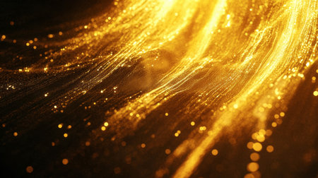 A stunning abstract representation of golden light waves and sparkling particles. This captivating image conveys richness and elegance, perfect for various design projects.