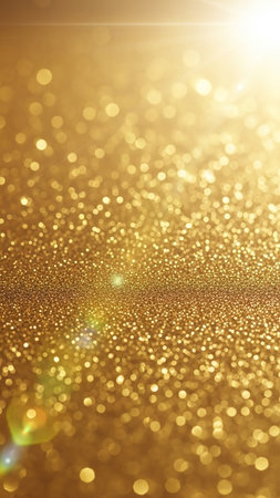 A golden sparkling glitter background with soft bokeh lights and a gentle lens flare creates a festive and abstract texture.