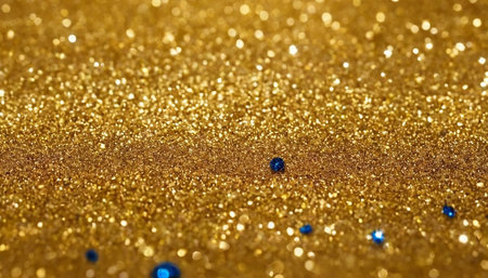 A close-up view of shimmering gold glitter with scattered blue rhinestones and soft bokeh lights.