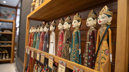 Hand-carved wooden figurines line the shelves at a bustling artisan market, reflecting the skill and artistry of local craftspeople dedicated to preserving tradition.
