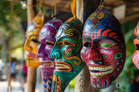 Colorful artisan masks hanging at a street market, showcasing cultural artistry