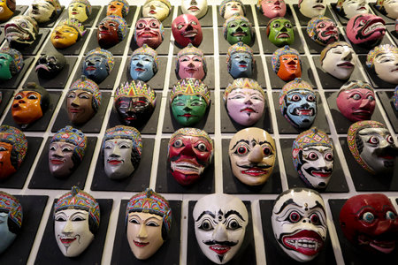indonesia traditional masks. Tribal ethnic decorative faces. Traditional warrior elements. Ritual accessories. Cult symbols. traditional Ceremonial . Native souvenirs. topeng wayang