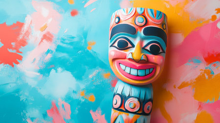 Colorful totem pole smiling on vibrant abstract background