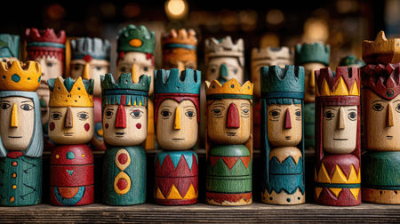 This captivating image features an array of colorful wooden figurines representing kings and queens, showcasing playful craftsmanship and vibrant details.