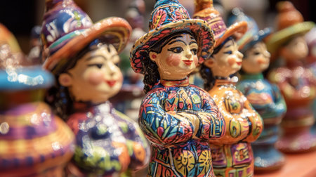 A collection of intricately painted ceramic figurines stands proudly, each displaying unique patterns and styles. The vibrant colors highlight the rich cultural heritage of the artisan community.