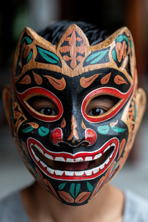 Intricate wooden mask with vibrant colors concealing a person's face.