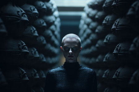 Pixelated humanoids wearing masks with red crosses represent a dystopian future, symbolizing conformity, control, and a loss of individuality in a technologically advanced society