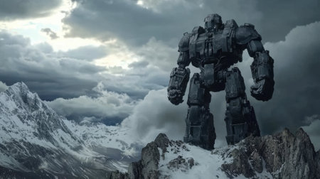 A colossal robot towers over a rugged mountain range, surrounded by ominous clouds, creating a captivating and surreal atmosphere in the wilderness.
