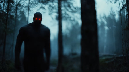 A tall, shadowy figure with glowing red eyes moves through a fog-laden forest during the twilight hours, creating an eerie atmosphere among the trees.