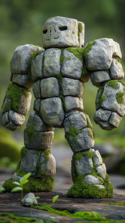 Close up of a stone robot standing on a wooden table with green moss