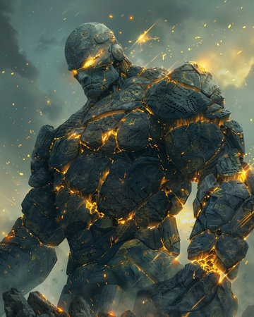 A colossal stone creature with glowing eyes emerges in a city, towering over skyscrapers while people on the ground watch in awe. The scene blends fantasy with urban environments.
