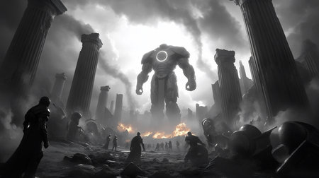 A large robot with a glowing eye stands amidst destruction and pillars