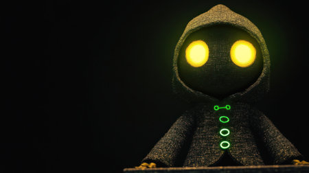 A captivating image of a hooded figure with luminous eyes, set against a dark backdrop.