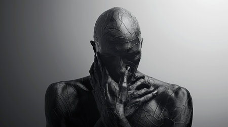 Black and White Artistic Portrait of Person with Metallic Body Paint Covering Face with Hands AI Generative