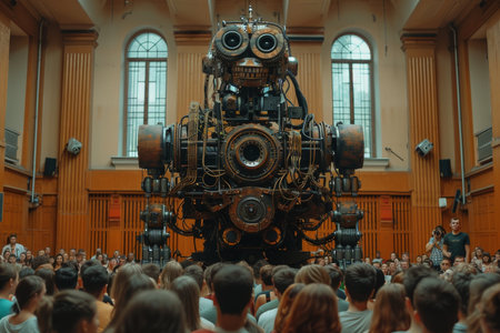 A futuristic robot lecturer engaging a diverse audience on technology s future in a conference hall
