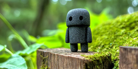 Black stone robot figurine on wooden fence post amidst greenery, symbolizing nature and technology.