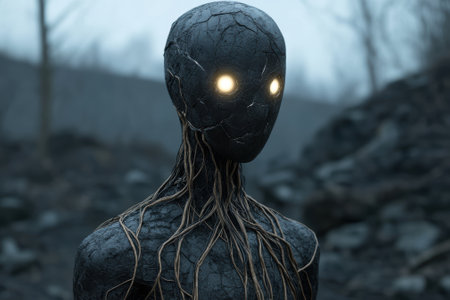 Mysterious figure with glowing eyes in a desolate landscape.