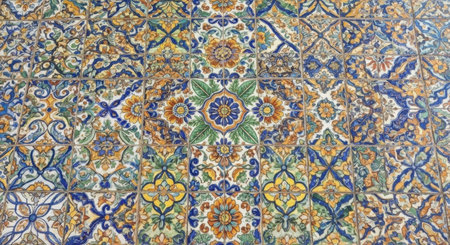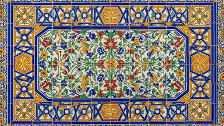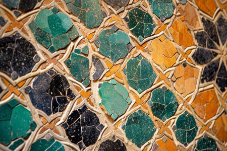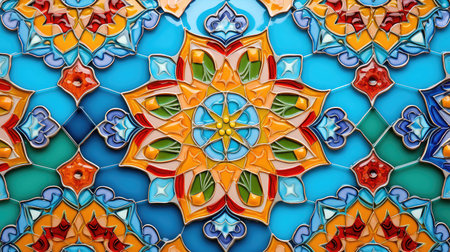 Vibrant and intricate mosaic pattern featuring geometric and floral designs, showcasing craftsmanship and cultural heritage
