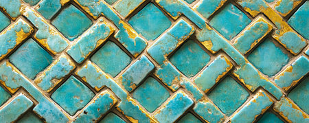 Turquoise mosaic tile pattern with gold accents, close-up view. Artistic design and decor concept