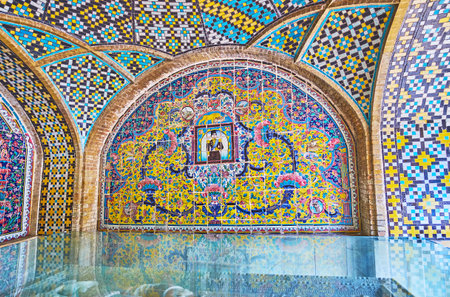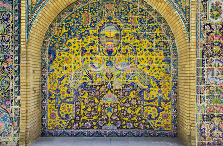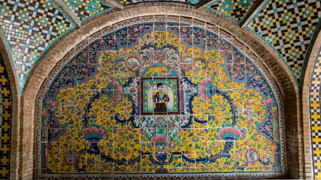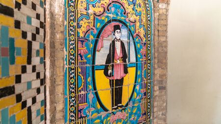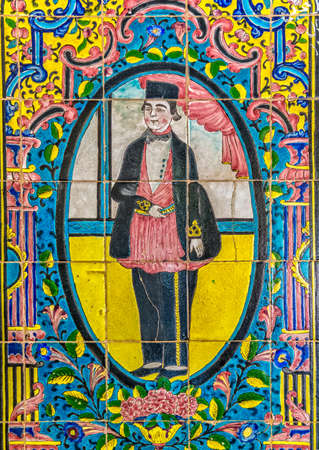 TEHRAN, IRAN - OCTOBER 11, 2017: The inner wall of Karim Khani Nook of Golestan, covered with traditional floral tiled pattern and the portrait of Persian Prince in the middle, on October 11 in Tehran.