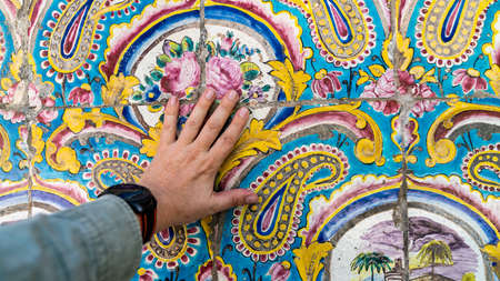 Tehran, Iran - May 2019: Hand touching colorful painting mosaic tiles on the wall at Golestan palace
