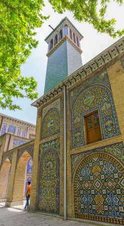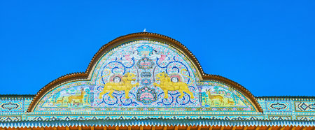 SHIRAZ, IRAN - OCTOBER 12, 2017: The pediment of Qavam House in Naranjestan complex is decorated with tiled patterns and Royal Qajar emblem - Lion and Sun, on October 12 in Shiraz.