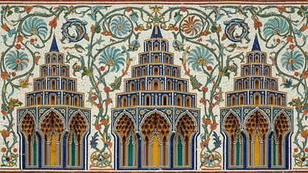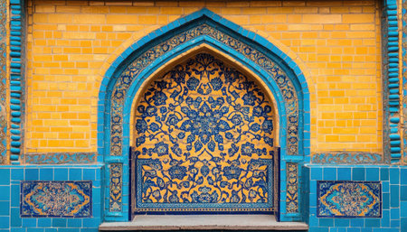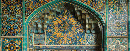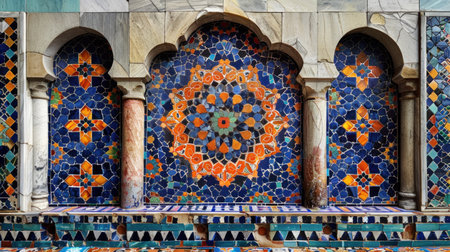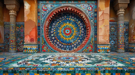 Explore the beauty of detailed mosaic patterns and arches in historical architecture. This vibrant image showcases the intricate designs and rich colors of an ornate structure.