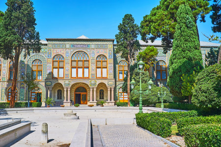 Tehran, Iran - 19 October, 2018: Amazing view of courtyard and garden at the Golestan Palace. Colorful mosaic wall decoration. Beautiful traditional Persian exterior.