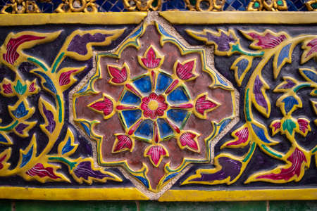 Close up of colorful thai ceramic, wall decoration of Palace in Bangkok
