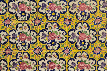 Old, traditional ceramic tiles, pattern of flowers and ornaments, vaulting on the wall in the Golestan Palace complex in Tehran, Iran.
