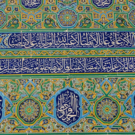 Detail of ceramic tiles with islamic floral ornaments. Floral patterns of Shia islam, Shiraz, Iran.