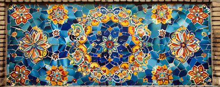 A traditional Persian mosaic wall adorned with intricate geometric and floral patterns in a mix of vibrant hues including sapphire blue, turquoise, and gold. The historical and artistic significance are beautifully showcased.