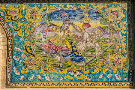SHIRAZ, IRAN - MAY 2, 2015: Entrance picture on the wall of the Rostam overcoming the Demon on old citadel Karmin Khan in the centre of the city.