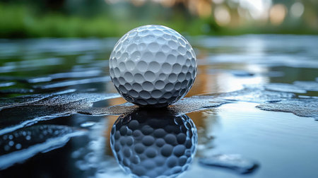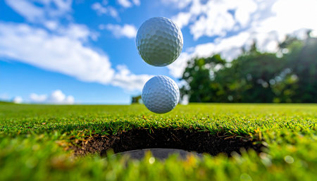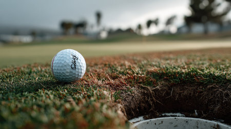 A close-up of a golf ball resting near a hole on a dewy, wet course. Photorealistic detail and soft lighting capture the anticipation of a successful putt in a serene outdoor setting.