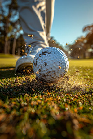 A stunning close-up image capturing the moment a golf club strikes a white golf ball on vibrant grass, showcasing the thrill and precision of the sport.