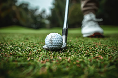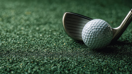 A golf ball rests near a golf club on a green surface. The image exhibits a close-up perspective with selective focus, showcasing texture. The composition uses a shallow depth of field. This image might be used for various commercial and editorial purposes.