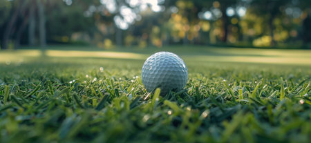 A single golf ball sits on lush green grass, bathed in the warm glow of sunlight. Trees blur in the background, creating a serene and inviting atmosphere.