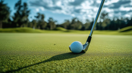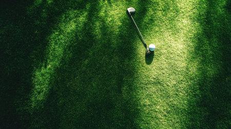 A captivating view of a golf club and ball resting on vibrant green grass, illuminated by bright sunlight and accompanied by soft shadows, inviting outdoor enthusiasts.